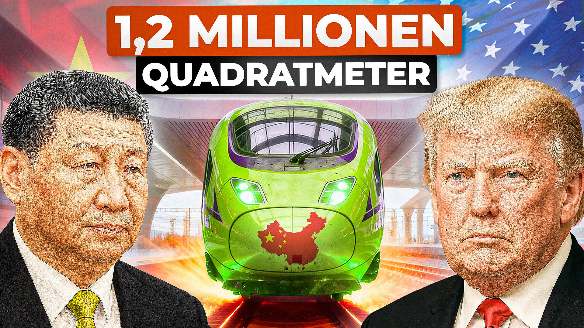 This thumbnail encapsulates the U.S.–China global struggle for power through their leaders, with the bullet train symbolizing China's rapid progress. The flags mark the East–West rift, and the lighting signifies significance. The German title "1.2 Million Square Meters" evokes scale, innovation, and geopolitical relevance — conveying progress vs. power in one memorable image.