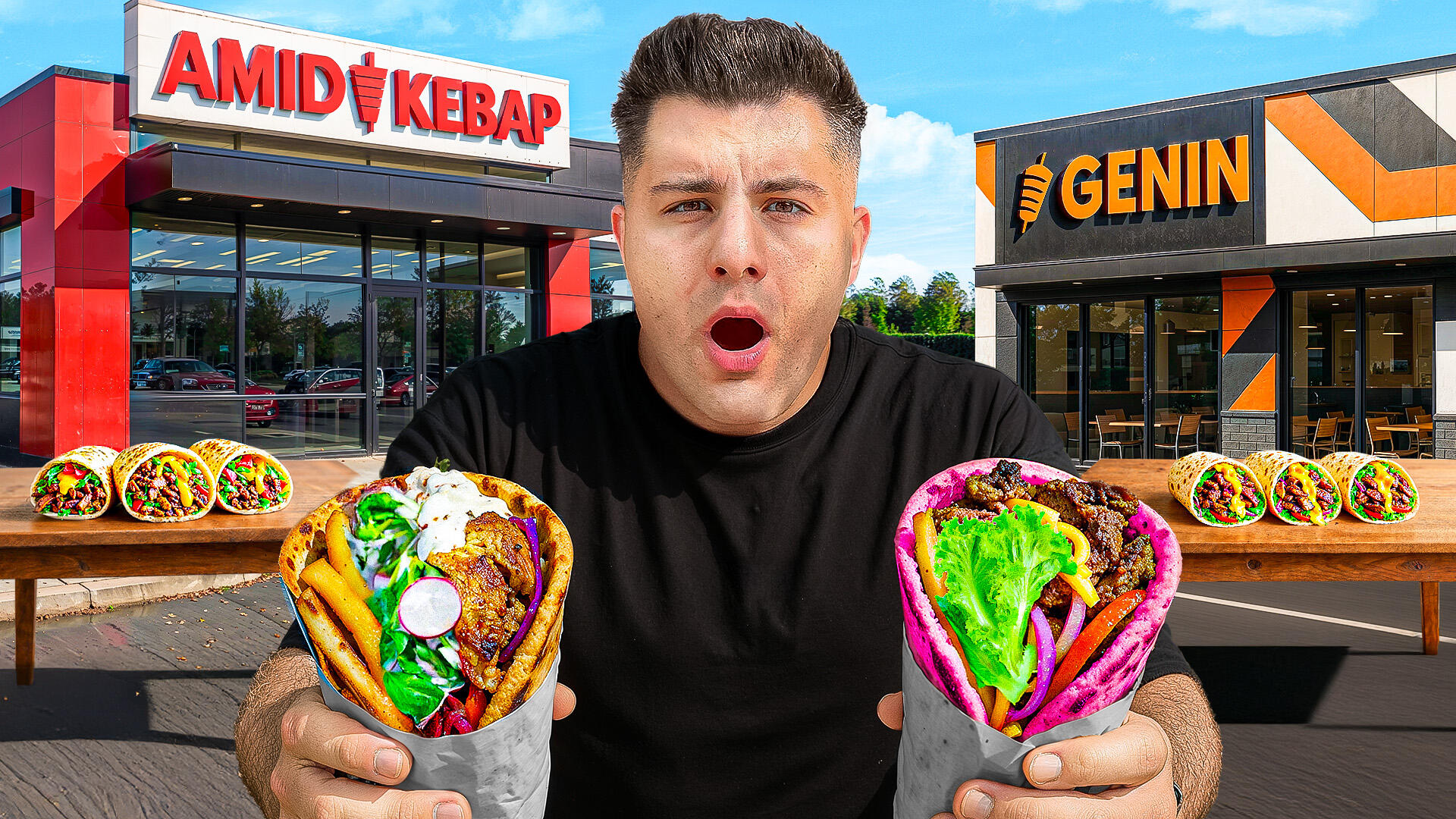 This thumbnail is a cheeky showdown between Amid Kebab and Genin, even-steven side by side for a sense of competition. The look of shock on the main character's face evokes emotion and curiosity, and the warm reds and calming purples highlight the food. It's a clean, high-impact shot that combines clarity, contrast, and storytelling in one frame.