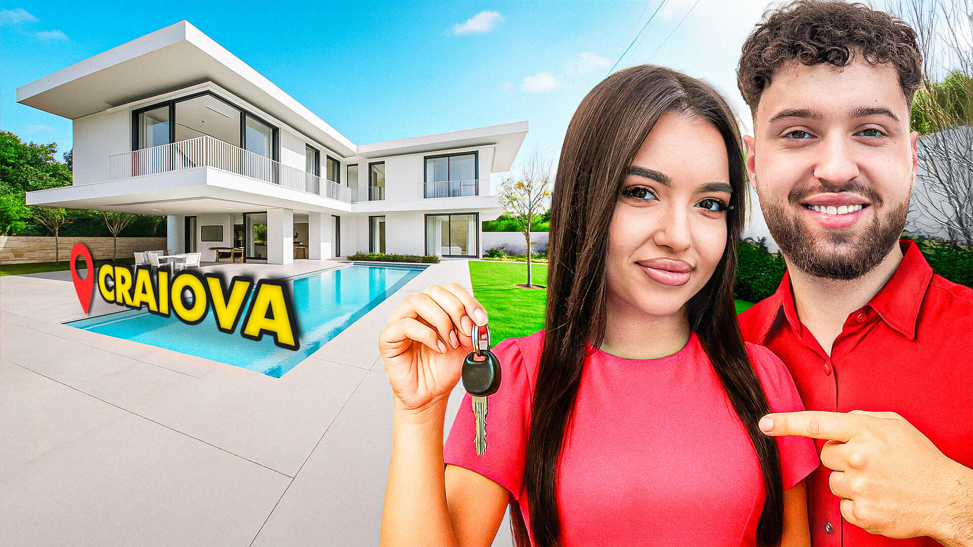 I created a colorful, eye-catching thumbnail: enhanced the house and pool colors to make them look modern, cropped out the couple and put them center stage, with the woman and key conveying the story right away. The red-vs-blue/green contrast adds a burst of color and balance — perfect to attract attention and unveil their new Craiova home.